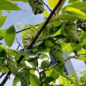 雨が止み雲の合間に青空。風が気持ち良く吹くお天気になりました。🍃 見上げると緑色の大きな実。 ポップに似てるが大きい。みのむしではない😆 クマシデでしょうか?