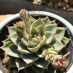 【エケベリア属 ファビオラ】 Echeveria 'Fabiola' 韓国流通名 パビオラ パピオラ 別名 レッド エッヂ E. 'Red Edge' ? 大和錦×静夜の交配種 タグは【ファビオラ】🏷 「Succulents LOVE」と タグに書かれた生産者さんの苗 交配式は E. purpusorum×E. derenbergii 同交配でアメリカの 植物学者 C. H. Uhl氏が作出、 オーストラリアの David Cumming 氏によって 命名された 【ベン バディス E. 'Ben Badis'】、 または【ケルニー E. 'Kernii'】 とも呼ばれるエケがありますが、 ファビオラはプルプソルムの 要素が強く出たのでしょうね 【ツルギダ E.turgida】と 言う名前でも流通していますが、 こちらは間違いだそうです ⏩次へ続く