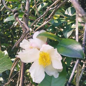 畑近くの集合住宅の 垣根から 白の山茶花が咲きだしました。 さざんかは焚火に繋がるんだった😅 今では落ち葉焚きもオチオチできません🚒👨🚒