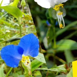 ツユクサ「露草」 ↙️日曜日に行った畑のまわりに他のものより花びらの大きなのが咲いていました。 ↗️昨日のコヒガンバナの近くに草丈30cmくらいのシロバナが1株ありました。