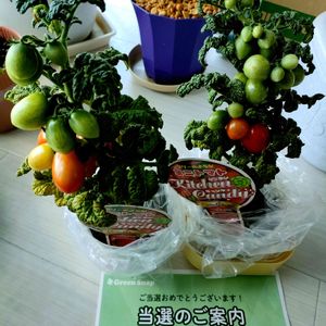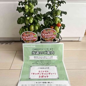 今日、モニターキャンペーンに応募した✨ミニトマト「キッチンキャンディー」2ポットが届きました😄🎶 とても嬉しいです☺️ 実が沢山ついていて🎵ビックリ🤭美味しそう😋 頑張って育てて、育成期間2ヶ月間、しっかりモニターしていきたいと思います😊 GreenSnap様、豊明市場様ありがとうございます🍅
