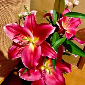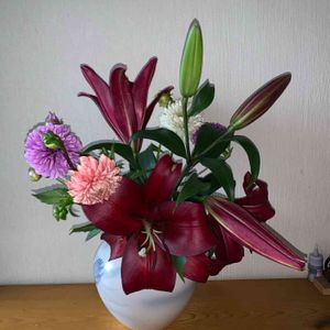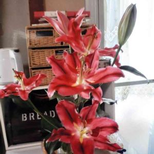 赤のカサブランカ…去年植えて咲かなかったのに今年2本咲きました✨ 数は少なかったけど😅雨が降る前にカット…🐱がイタズラ あっちこっちに場所移動🤭