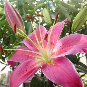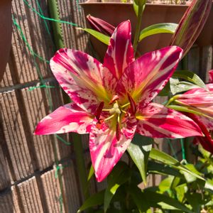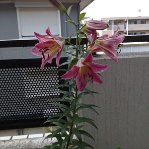 カサブランカ咲きました❣️😄 正式なカサブランカは白いものだけだと伺います。 お迎えした時のタグにはカサブランカと...。 色が気に入ってお迎えしたので 咲いてくれたらそれで良し👌 半月ほど前に吹いた強い南風で 上の方の小さな蕾が傷だらけに。🥲 これから所狭しと咲き競ってくれることに感謝😘💕