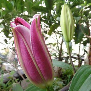 4月に球根を植えて、初めて咲くスコーピオ。 別名、レッドカサブランカ。🏡 まだ蕾なのに凄い迫力と期待感があります。🎵
