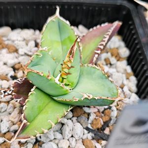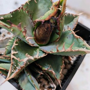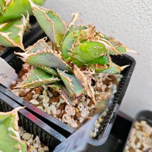 今日は晴れたり曇ったり。 洗濯物がカラッと乾きづらいです。 アガベ チタノタ 金蟾 鋸歯で葉をロックしてしまい展開出来ず 子株をふいてしまってます。 キッチンハイターをかけて鋸歯と葉を 柔らかくして、なんとか外しました。 ブツブツのせいで、余計に葉が絡まってました。