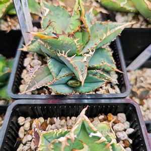 アガベ! !付けないとやってられない… ①金蟾 成長早い!鋸歯多くて楽しみ! ②白毫刺 こっちは逆に遅め。 ③妖蟹 イシスが入ってると、薬剤散布で まだら模様になっちゃいますね。 ④血蟹 成長速度は①と②の間くらい。 スポットが良きかな。 と、長々書きましたが結論みんなカッコいい。