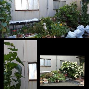 ⬆️ 綺麗に片付けた柏葉あじさい ↙️3メートル越えの巨大ひまわり🌻 蕾が見えます👀‼️ ↘️満開だった頃の柏葉あじさい ps, 柏葉あじさい片付けて、ゴミ袋 四つ 👀‼️ かなり疲れました…😮💨