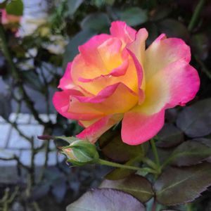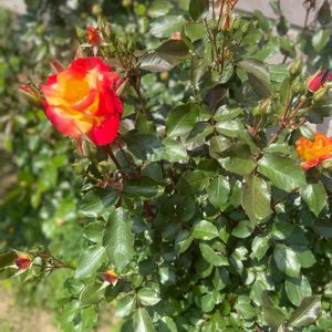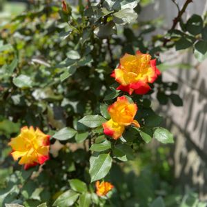 地植えの薔薇チャールストン♪ 何度も黒点病にかかって根本の葉っぱはほとんどないけど、頑張って咲いてくれました! 黄色から赤に色変わりして綺麗🌹✨✨