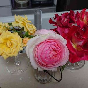 うちの花がら三姉妹です❣️ 右からチャールストン、ピエールドゥロンサール、ミニバラ黄色(頂き物で名前知らず…) キッチンに立ったら、いつもは無いやる気がでますわぁ(笑) ホームステイで朝昼晩作るの面倒くさっ😅