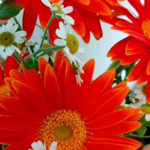 マトリカリアがまだ少し咲いてたのでガーベラをさしてみた、鮮やかカラー❤️