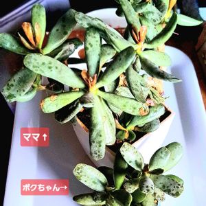 おはようございます😃☔ アドロミスクス・ボルシー👽👽 シミシミ推しのボルシー親子、ボクちゃんは葉挿し育ち🌱どちらも新芽も出て来て嬉しいな🎶 よい一日を🐬.。o○🌈🌏