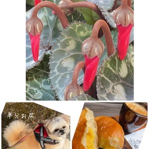シクラメン ⬆️🏷️金曜日の蕾たち 🏷️オケツの日 ⬅️トリミング後の、ちょっとだけお尻の🐶💦 『あぁ…しんどかった💦』と不満気です🤣 ➡️ゆずの入ったクリームパン🥐🎶 かなり番外編ですが、ゆず🍊でお許しを😅 香りがとても良かったです😅