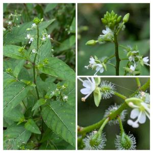 ミズタマソウ (水玉草 )アカバナ科ミズタマソウ属 富士山麓に行ったの帰り道、有名なかき氷屋さんに寄りました。 想像以上の1時間待ち。 やることないので、周りをキョロキョロ。 なんと初めましてのミズタマソウが咲いてました。 北海道〜九州の山野の木陰などに生える。高さ20〜60cm。茎には下向きの毛が生え、節は赤褐色を帯びることが多い。葉は対生し、長さ5〜13cm、幅1.5〜4cmの長卵形〜卵状長楕円形で先端はとがり、ふちには浅い鋸歯がある。茎の先や上部の葉腋から花序をだし、白色または淡紅色の小さな花をつける。花弁は2個で2裂する。堅果は直径3〜4mmの広倒卵形で、カギ状に曲がった毛が密生する。花期は8〜9月。 名前の由来は毛の生えた果実が水玉を思わせることからです。