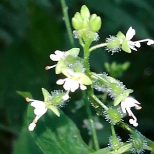 ミズタマソウ(水玉草) *アカバナ科ミズタマソウ属 花期は8〜9月 北海道〜九州の山野の日陰に生える多年草! 高さは20〜60cm 茎には下向きの微毛あり、節が赤色を帯びる事が多い! 葉は対生し長卵形で縁に低い鋸歯! 基部はくさび形〜卵形で葉柄がある! 茎の上部や葉痕から総状花序を出し小さな花を付ける! 花弁2個.萼2個.雄蕊2個.柱頭は2裂! 後にある小房のカギ状に曲がった毛が目立ち、果実が熟すとひっつき虫となる! 名前は白い毛の生えた球形の小房を水玉に例えたもの❣️ 8月16日撮影