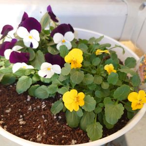 こんばんわ! 仕事忙しくお久しぶりの投稿に😢 まずは玄関のお出迎え用𓂃𓂂ꕤ*.゚ ビオラのフィオリーナと オレアリア寄せ植えに🌼*・ 花色が素敵です☺️