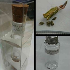 備前岡山 妖刀叢雨 拵えは部羅部留(ブラベル)造り 柄糸は羽衣 刀長11mmの直刀、鍔は種皮 刃先に行くに従い緑を帯び、透き通る様な美しい刀身。 ブラックベルディアナ羽衣 × ムラサメ の種子からです。