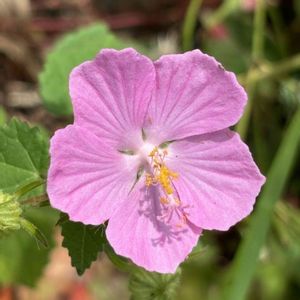 この花も主のいないと思っていた庭の花です。 2センチくらいの小さい綺麗な桃色の花。フヨウの小型版のようです。 🩷桃花姫岩フヨウ🩷 アオイ科 開花期:8〜10月