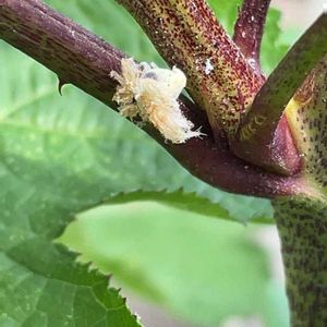 朝パト中 ブルーベリーに白いモケモケ発見👀 初めて見たけどなんぞこれ??? こういうときはとりあえずGoogleレンズで即検索🔍 ・チュウゴクアミガサハゴロモ ・アオバハゴロモ どっちかわからんけどこの辺り説が濃厚っぽい チュウゴクアミガサハゴロモの親姿見たらこの前某店舗のドアに張り付いてたやつじゃん🤦♀️ 幼虫に至ってはなんかのSNSで白いふわふわが可愛く踊ってるところ見たことあるのよ こやつら幅広い植物を宿主としていて高い繁殖力で爆発的に増えている害虫らしい😱 成虫も幼虫も植物の汁を吸い卵を産む事で樹勢の低下や枯死を引き起こすとな☠️ 白いふわふわだけ落としても枝の中に卵を産んでいるから意味ないみたいで枝ごと切り落とすか削り落として焼却か燃えるゴミで出しましょうとの事です。 日本でも経済的被害が懸念されているけど外来種でまだ登録農薬はないみたいなので皆様見かけたら気張って滅しましょうか😭