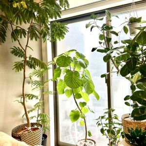 お気に入り😊フィカス大好き😘ちっちゃな葉っぱがかわいいフィカスルビキノーサ😊フランスゴムの木🇫🇷 フィカス・ルビギノーサ(Ficus rubiginosa)は、一般的にフランスゴムの木として知られる、オーストラリア原産の観葉植物です。その最大の魅力は、個性的でインテリア性の高い樹形にあります。 【主要な特徴】 • 樹形と幹: 幹がしなやかで弾力性があるため、意図的に曲げられたS字や曲線状の樹形(「フランスゴムの曲」)が多く流通しています。この動きのある幹が、空間にモダンで洗練された印象を与えます。 • 葉の特徴: 葉は小判型で厚みがあり、濃い緑色に強い光沢を持つのが特徴です。一般的なゴムの木に比べると葉が小ぶりで、スッキリとした見た目です。 • 育てやすさ: フィカス属の中でも特に丈夫で育てやすい品種です。比較的高い耐陰性を持つため、明るい室内であれば容易に育てられます。水やりは、春〜秋は土が乾いたらたっぷりと、冬は乾燥気味に管理するのが基本です。 • 花言葉: **「永遠の幸せ」**という縁起の良い花言葉を持ち、新築祝いや開店祝いなどのギフトとしても人気があります。 耐寒性はやや弱いものの(最低5℃〜10℃)、丈夫で管理しやすく、モダンなインテリアに合うため、初心者から愛好家まで広く親しまれている観葉植物です。