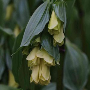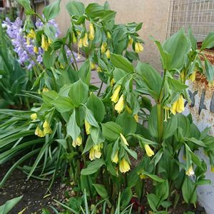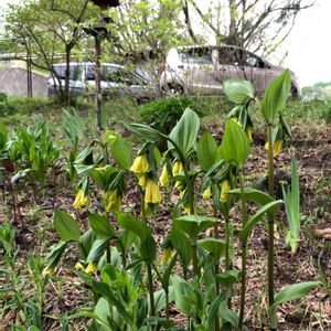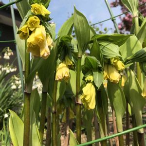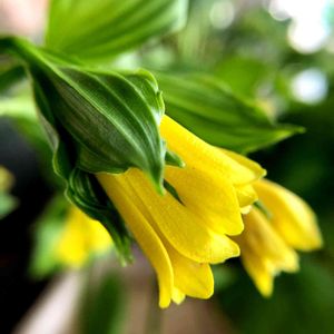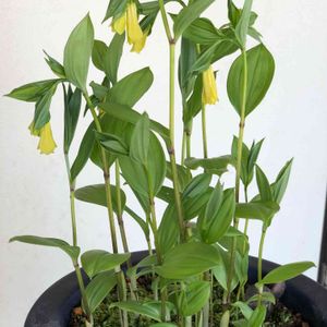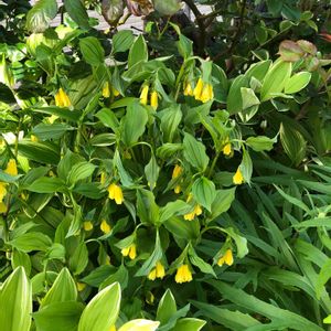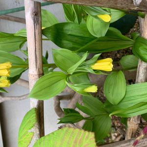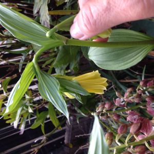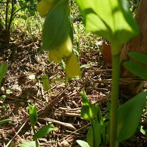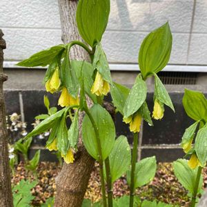 黄花宝鐸草(キバナホウチャクソウ) チゴユリ科チゴユリ属 別名、黄金ホウチャクソウ 庭の隅にあってよく増えます。 名前は、堂塔などの軒の隅に下げられる宝鐸(風鐸)に似ることによる。