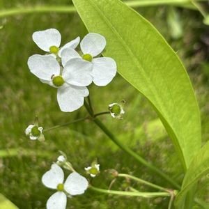 秋らしくなって来ました。 [今日のお花] 'オモダカ'(沢瀉、面高) 別名:ハナグワイ、サンカクグサ、勝ち草 水田雑草の一つ 3枚の白い花が水田の畦ぎわに咲いています。 沢瀉は日本十大紋の一つ。 ※面高という字が「武士の面目が立つ」に通じ、葉の形が矢尻に似て、別名「勝ち草」とも呼ばれて縁起がいいことから武家の家紋として普及したそうです。(ネット情報) 食用のクワイはオモダカの変種。 1️⃣2️⃣ヘラオモダカ 葉がへらの形。 雌花(中心が黄緑色のかたまり🟢) 佐倉くらしの植物苑 2025.5.14 3️⃣オモダカ 2025.8.24 雄花(中心部が黄色🟡) 田んぼの畦ぎわ ※塊茎が養分を奪ってしまうので田んぼにとっては害草‼️ 4️⃣オモダカ 2023.7.26 雌花🟢が輪生しています。 ↙️左下隅に矢尻の形の葉が写っています。 5️⃣オモダカ 2022.8.10 雄花🟡 里山の溝 矢尻の形をした葉を見てもらおうと古いpic探して来ました。 ※若い葉は線形ですが生長すると矢尻形になります。
