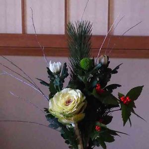 正月の花を楽しむ💛 🎍明けましておめでとうございます🌅 今年もよろしくお願いします🤲 作業場のある家の周りには狭いながらも色々な植物が生きづいている🌼🌸☘️🌿 先代が植えたものや自然に生えたものも❣️ 冬になって殺風景にと思いきや、千両や南天が彩りよく実をつけて刈り取ったシダの新芽が這いつくばるように緑を広げている🌿 ひっそりと人の目には触れない裏庭。 植物をひとつにまとめて庭を凝縮して見た☘️❣️ お花の流儀は知らないけど 水引を添えるとなんとか正月の花らしくなった🌸 みんなに見てもらおうね、庭の植物たちよ🌼☘️🍒🌿