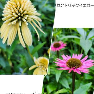 *エキナセア* レモンイエローで八重咲きのエキセントリックイエローと、黒じくでピンクのフロフュージョンが仲良く咲いています。 エキナセア大好きです。
