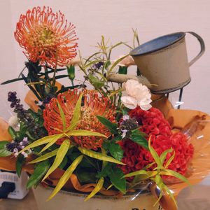 週替りのアレンジ32 今週はなぜかハムスター付き(笑) 渋い色のガーベラとワックスフラワーがチャーミングです!
