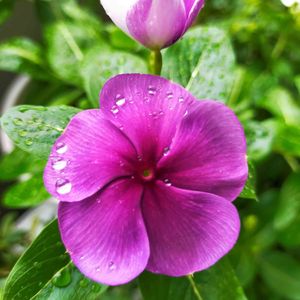 急に寒くなった雨の朝です。 ビンカタトゥー ブルーベリーの 上に雨の滴がぽんぽんぽん💧 パティシエさんが デコレーションしたみたい💜