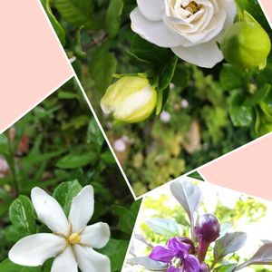 ☀️今日は梅雨の中休みかな? ちょうど🤍クチナシの花が 咲き始めてました 八重咲きのと一重咲き! 昔、一日で青虫に丸坊主にされた事あってから 不得意な花でしたが、 いただいたのをきっかけに育ててます🤩 今のところいい感じ! 🤩右下のは一昨日投稿した、鑑賞用唐辛子の オニキスマジックオレンジ🧡 の、花です! 開花しました🤗 てっぺんのはどうやら咲いた後で実になりかけのみたいです😅 これが🟠オレンジになるのかな😄 楽しみです🎶