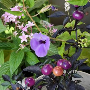 🩷混み混みですが 朝は元気😄 4種あります。 ペンタス トレニアカタリーナ ジュズサンゴ 鑑賞唐辛子のオニキスマジックオレンジ 鑑賞唐辛子のオニキスマジックオレンジ🌶🟠は 🟣紫色の珠だったけど 少しオレンジがかって来ました! それを見てもらおうと思ったら、周りの子達も 私も写してー😄 って言った気がして💖