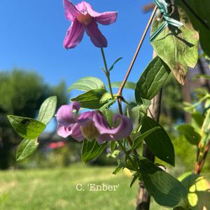 木立ち性のインテグリフォリア系クレマチス ピンクのエンバー 今年から 紫のクリル 4年目 エンバーは購入してすぐに枝をポッキリしてしまったのですが、マステで巻いて支柱に留めておいたら無事に咲いてくれました🥰
