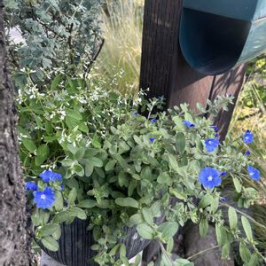 ポスト横の寄せ植え アメリカンブルーとPWさんのユーフォルビアダイアモンドフロスト で涼しげになるように植え替えました 影にダイアンサスフルーリアムールサクラドロップもひそんでいます 雨降り2日目の朝です