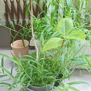 都会暮らし、の我が家。 一番大事に育てているのは、猫用の雑草です。 夏はたくさん茂って嬉しい。 なんかゴムの木系の観葉植物のあしもとにも、もっさり
