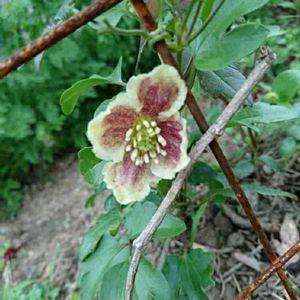 クレマチス✨カリシナ✨ シルホサ系❇️秋冬咲きなのに 下の方に申し訳なさそうに咲いてくれています。 ベル咲きで花弁の内側にワインレットのブロッチが入っていて… 可愛い花ですよ! 草むしり(^^;💦二つ目のご褒美✨💞