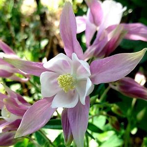 庭に地植えのオダマキ🌺 マキノキの下に植えてあるので木漏れ日を浴びて 気持ち良さそうに咲いています🤗 上品な色合いです💜
