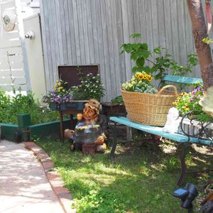 私の一番のお気に入りコーナー ななかまどの木の下 木陰で涼しいの 先日残ってたペンキでベンチを塗りました 明るくなって可愛いくなった ╰(*´︶`*)╯♡