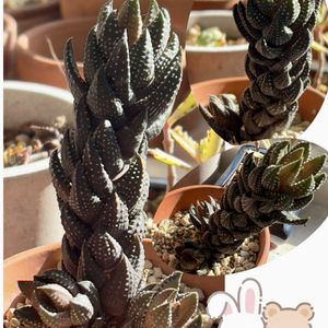 「ハオルチオプシス 九輪塔錦 白斑」 小さいうちから子株が2つ上がってきてからは 親子ともに葉っぱが細くなり悩ましい限りです