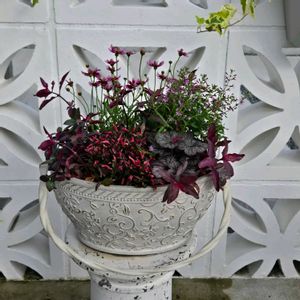 連投失礼します(⋆ᵕᴗᵕ⋆).+*ペコ 今日作った寄せ植え🌷.* 使用花材🌼🌿 ブラキカム・ブラスコバイオレット🌼 トルコキキョウ・小夏ホワイト🌼 トウガラシ・オニキスマジック🌿 アルテルナンテラ・マーブルクイーン🌿 アルテルナンテラ・マーキュリー🌿 パープル💜のブラキカムとオレンジ🧡のトウガラシを使ったハロウィン🎃寄せ植え🌷.* 白🤍のトルコキキョウが良いアクセントになっているかも😋 シックなネイビーのバスケット🧺も良い感じ♡(⑉︎• •⑉︎)♡ᔆᵘᵗᵉᵏⁱ♡
