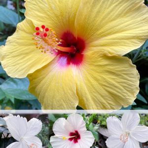 今朝のハイビスカス 先日に続き 今度は八重のハイビスカスが 双子ちゃんです💓 先日双子ちゃんだった黄色のハイビスカスは今日はおひとり様 そして初開花は 原種ハイビスカスロバツス 毎年種まきしますが 種まき組はまだ小さく 昨年の一本だけ冬越しさせていたのに やっと花が咲きました🌸 一つ咲くと次々咲いてきますね😊 今日も元気出していきましょうね♥️