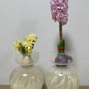 ヒヤシンスの水耕栽培🪻 みなさんの投稿を見て、自分もやってみたくなり、今回初チャレンジしました。 でも、やはり難しいですね💦上手く育てられなかった⤵︎ 赤、ピンク、紫、白の4色を育てて、それぞれバラバラのタイミングで一つずつ咲きました🤣花もあまり長持ちしないのは、ずっと温かい部屋に置いてあるからなのかな? 香りが素晴らしく良く、咲くととっても幸せな気持ちになりました😊🍀 最初は瓶の上に球根を置いただけでしたが、花茎が伸びるとバランスが崩れて倒れてしまうので、みどりのまとめで見たワイヤーで固定するやり方を真似してみました🫙🧄 たくさんの方の水耕栽培の投稿も大変勉強になりました😊また来年も挑戦してみたいです♪