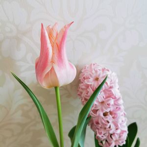 水栽培のヒヤシンスとチューリップ咲きました チューリップは白が咲いて、薄ピンクのシルバークラウドは球根が限界だったので、カットして切り花に 球根は土に植えて(鉢植え)養生中です 桃色ヒヤシンスいい色! 来季はもっと育てたい