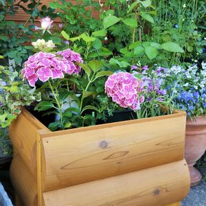 今日の主役はこの鉢カバー🎵 昨日お友達の自作品を抱えて遊びに来てくれました🎵 迷いに迷ってこの子達を💗🥰 ↖️アイビー ↑アナベル ↗️ルミナスピラー ←紫陽花 →? 後で一輪 プリンセスドゥモナコが咲き始め❤️