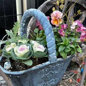 🟨葉牡丹🟩 ありきたりですがハボタンです。パンジーなどと並ぶ、今の時期を代表する植物ですね✨ 園芸店に行くと、それはもうすごい数で、様々な色や形のハボタンがあります。基本は白と紫ですが、中には色水を吸わせた青色や赤色のものもありました🫢 白と緑が混ざった美しい葉牡丹を見つけたので、それをメインに寄せ植えを作ってみました。ケチなので鉢に対して植物が少ないですが、すぐ成長してカバーしてくれることでしょう🙂↕️ こんなにちゃんと寄せ植えを作っても、夏には枯れてしまうのはちょっと悲しいですね😅
