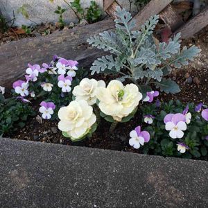 65型プランター寄せ植えの定点観測④ 何本かの葉牡丹を抜き、形の良い先端部と花芽をそのまま植え直しました。もちろん根は生えていませんので挿しただけです。 元々、定点観測を始めた12月時点で、このプランターに植えた葉牡丹のほとんどは根のない状態でした。一年を通して綺麗な状態の先端部を切っては挿すを繰り返して活用しますが、枯れることはほぼありません。葉牡丹って本当に使える子です✨✨ 根のついた元株は別の鉢で養生しています。 シロタエギクも半分くらいで切り戻し、そのまま挿しています♪ そしてカルーナ、やっと姿が見えるようになりました🌱 追記/定点観測No.つけました