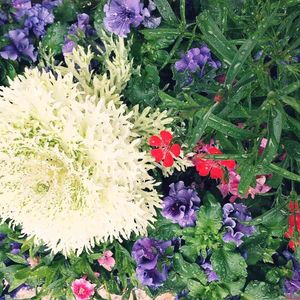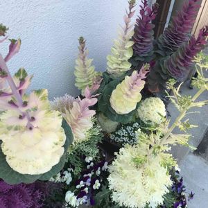 おはようございます😊 去年作った寄せ植えです💕 手前の『バコパ』と『ヒメツルソバ』が入り混じって咲くような寄せ植えにしたかったんですけど… 庭に生えてるヒメツルソバをちょっと入れただけだったので、なかなか大きくならず…💦 モリモリになるまで待ちきれなかったようで『葉牡丹』が伸び伸びになってしまいました😅 失敗、失敗ꉂꉂ(๑˃▿︎˂๑)ァ,、'`💦 ちゃんと計算して植えないといけないですね〜😓 難しいなぁ💧