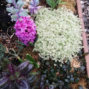 セダムが増殖、アジュガはランナー❓を伸ばし、ベロニカは銅葉が深緑に、ヒヤシンスは香りを、葉牡丹は蕾を、オダマキの新芽が、、、そして僕は☕😃🚬