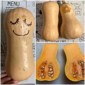 いただき物のバターナッツカボチャ🎃 何年か前にもらった時は煮物やサラダに! 今回はスープにしてみようかな 水分多めで甘味もあります💕 形が可愛くて思わず顔にしちゃいました😊