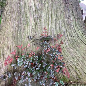 大きな杉の木の根もとに艶やかな南天の幼い木。 実を付けるのは何年後でしょう😊