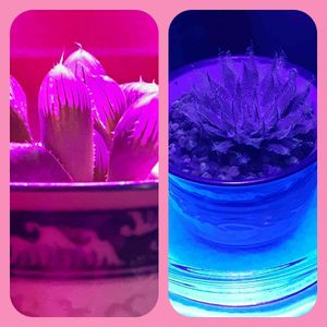 左の光は、青の波長の光と赤の波長の光。育成用ライトの色合いだね。。 右は紫外線ライト。 紫外線は通過すると認識していたけど、育成に影響するんだ。 気孔の開口にも関係している。 ミトコンドリアにも影響。 DNAに影響するから、異変が出る可能性も。🕷 なるほどね。🧒🏼